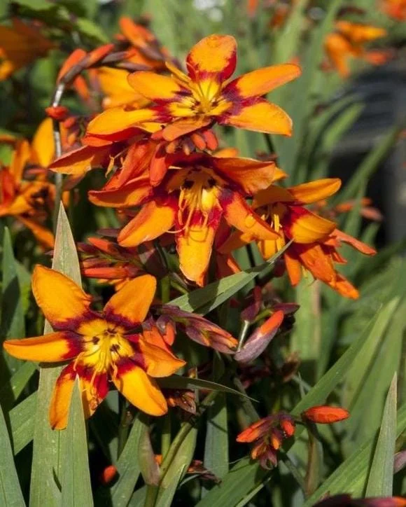Once established, these orange montbretia tuber plants are quite drought-tolerant, but they benefit from moderate watering during prolonged dry periods, especially during their blooming season. Keep the soil evenly moist but never soggy. Fertilize in early spring and again during the blooming season with a balanced granular fertilizer (e.g., 10-10-10) to support vigorous growth and abundant flowers. Taller plants may occasionally require staking to prevent flopping. Deadhead spent flowers to encourage continuous blooming throughout the season. In fall, cut back the foliage after it turns yellow. In colder zones (below USDA Zone 6), it’s recommended to lift and store the corms indoors for winter, while in milder climates, a thick layer of mulch can provide sufficient protection. Dividing clumps every 3-4 years in spring or fall helps prevent overcrowding and maintains vigorous blooming.