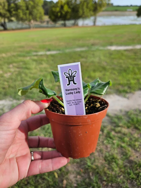 - Q: What size pot does it come in? A: This Harmony’s Lucky Lady African Violet is shipped in a 4-inch nursery pot, perfectly sized for a young starter plant. You can repot it into a slightly larger decorative pot as it grows.