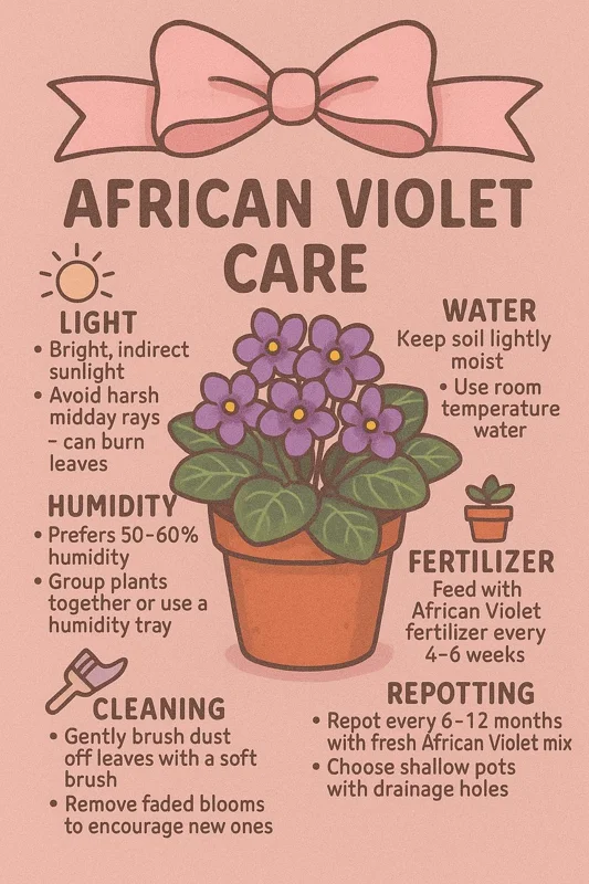 - Q: How can I encourage more blooms from my African Violet? A: To encourage more blooms, provide consistent bright, indirect light, use an African Violet specific fertilizer during the growing season, and maintain consistent moisture without overwatering. Proper African Violet plant care leads to abundant flowers.