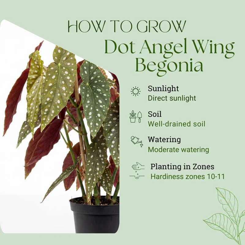 - Q: Can I propagate this plant? A: Yes, you can propagate the Dot Angel Wing Begonia live plant from stem cuttings placed in water or moist soil.