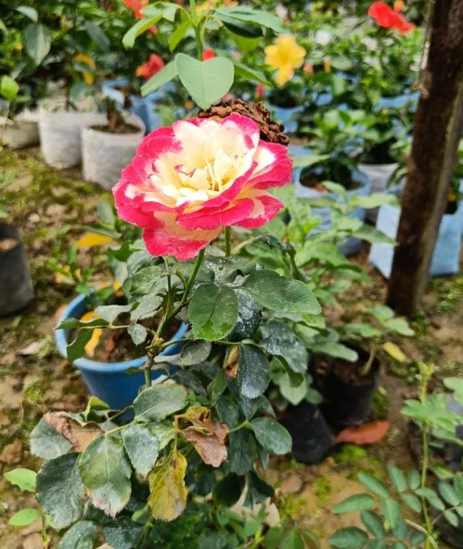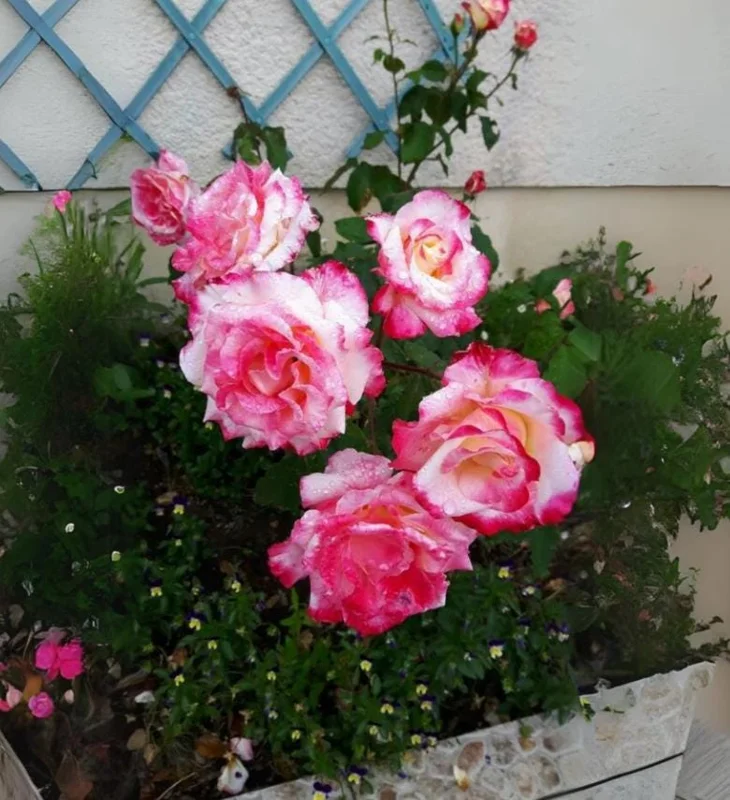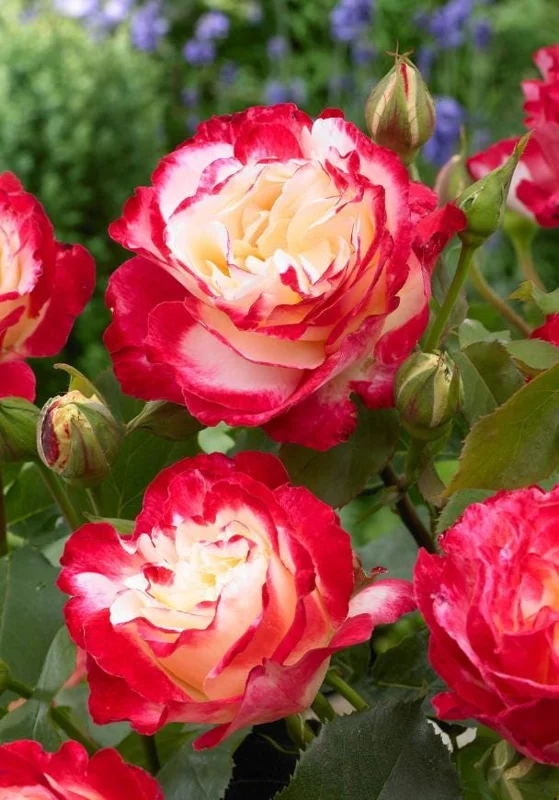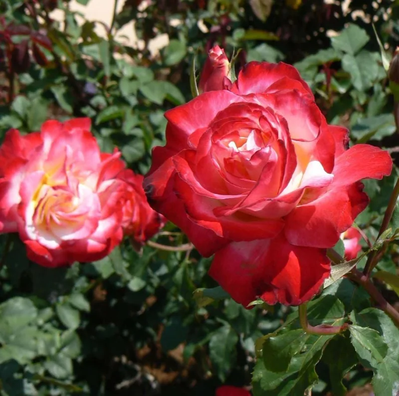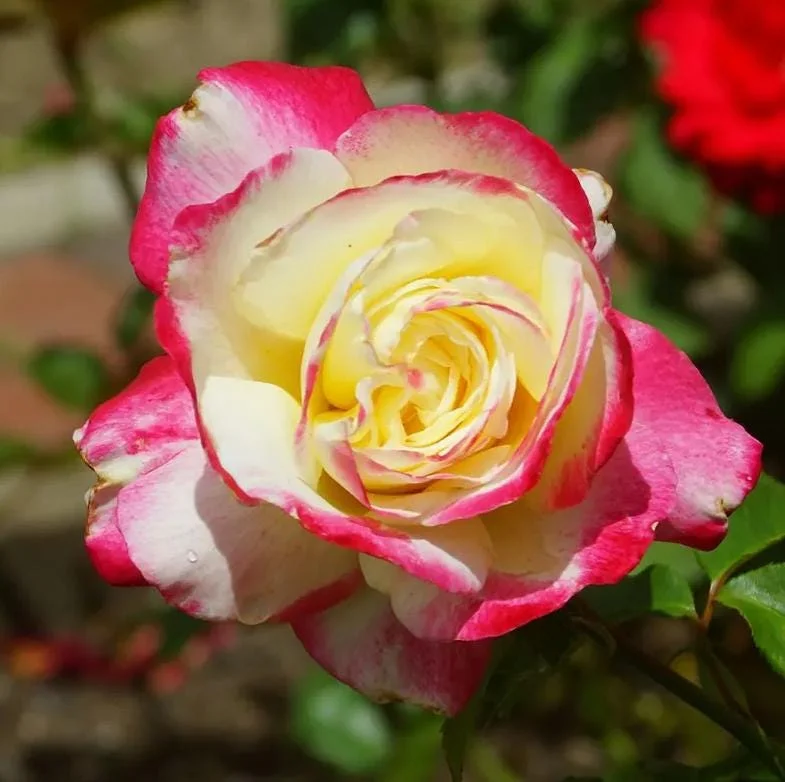 Hybrid tea roses are admired for their graceful flower shape and tall stems. Their striking blooms often become a focal point in the garden, adding visual interest and seasonal color. The bi-color petals create a beautiful contrast that blends well with other flowering plants and greenery in many garden styles, including cottage gardens and decorative landscape beds.