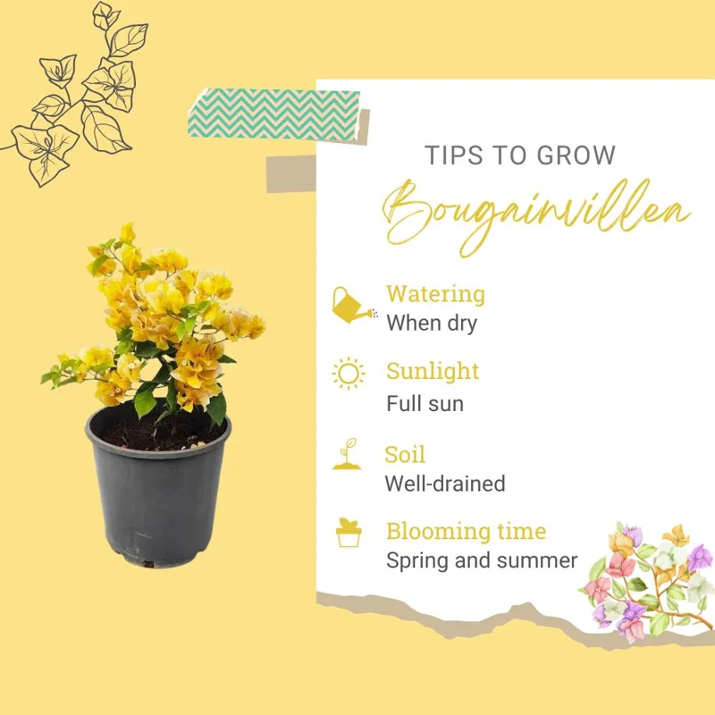 - Q: Is this plant easy to care for? A: Yes, once established, the tropical Bougainvillea plant is relatively low-maintenance. It primarily needs consistent full sun, well-drained soil, and occasional watering, along with pruning to maintain its shape and encourage flowering.