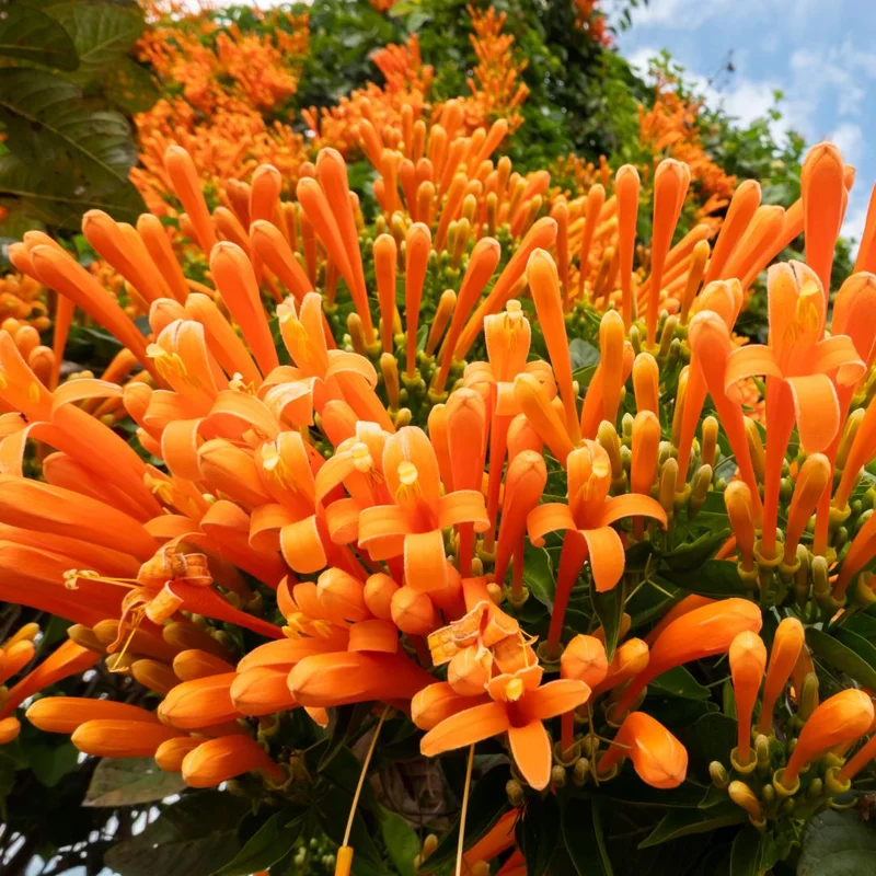 Water newly planted vines regularly to keep the soil consistently moist until they are well-established. Once mature, Orange Trumpet Vine live plants are quite drought-tolerant and will only require supplemental watering during prolonged dry spells. Fertilize sparingly in spring with a balanced, slow-release fertilizer, as too much nitrogen can promote foliage growth at the expense of flowers. Pruning is essential for managing its vigorous growth and promoting flowering; prune in late winter or early spring to remove dead or weak wood and to shape the plant. You can also cut back to a few main stems to control its size. This fast growing vine benefits from strong support like a sturdy trellis or arbor to climb on.