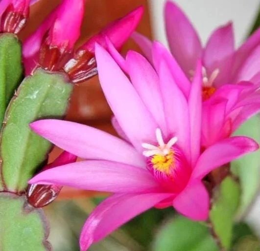 This pink Easter cactus plant arrives as a vibrant, healthy young specimen, perfectly sized for immediate display. It is typically supplied in a 2-inch nursery pot, providing a strong root system to help it establish quickly in its new home. The plant features multiple flat, segmented green stems that form a compact, slightly trailing mound, ready to produce its characteristic star-shaped pink blooms. While young, it will grow to a mature size, typically reaching a height of 8-12 inches and spreading up to 12-18 inches, making it a medium-sized houseplant.