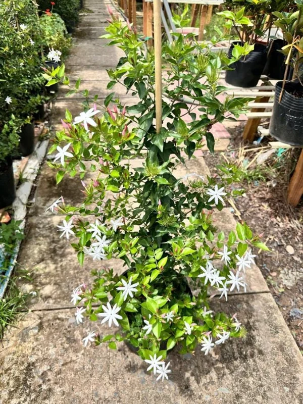 For soil, the Downey Jasmine live plant is not overly particular but thrives in well-draining soil that is rich in organic matter. A slightly acidic to neutral pH is generally preferred. Good drainage is essential to prevent root rot. This plant is cold hardy and does well in USDA Zone 9B and warmer. In Zone 9B, while it can tolerate some cold, providing a layer of mulch around the base or covering it during unexpected hard frosts can offer beneficial frost protection. Fertilize in spring with a balanced, slow-release granular fertilizer to encourage vigorous growth and prolific flowering. Pruning is important to maintain its desired size and shape, as this white flowering jasmine can grow quite large if left unmanaged. Regular trimming will also encourage bushier growth and more blooms.