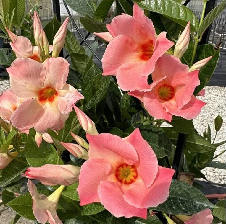 Introduce breathtaking beauty to your outdoor space with the stunning Giant Peach Mandevilla Vine. This live plant, also known as Brazilian Jasmine, is a vigorous tropical flowering vine celebrated for its spectacular, funnel-shaped blooms and lush, glossy green leaves. Originating from tropical regions, the Mandevilla brings a vibrant, exotic flair to any garden, patio, or balcony. Our 5-9 inch tall plants are ready to establish and grow, providing continuous color throughout the warmer months. Ideal for trellises, arbors, or hanging baskets, this Mandevilla quickly transforms ordinary spaces into extraordinary botanical displays. Its vigorous growth and stunning aesthetics make it a favorite among gardeners seeking a high-impact, easy-to-care-for flowering vine.