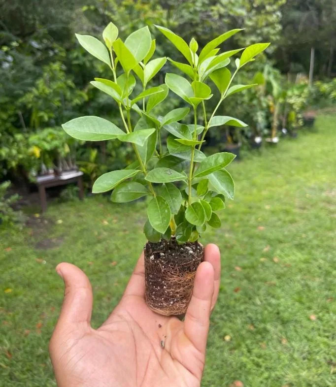 You will receive a healthy strawberry guava tree live plant, a vigorous starter plant typically measuring 5-9 inches tall. These young plants are well-rooted and ready for transplanting into your garden or a larger container. While currently a starter, the strawberry guava is a moderate grower and, if left unpruned in tree form, can eventually reach a height of up to 20 feet with a smooth trunk. Its leaves are oblong, typically 2-4 inches long, dark green, and aromatic. The flowers are white, about 1 inch long, featuring 4-5 petals and numerous stamens, adding to its visual appeal before fruiting begins. This plant ships without a pot, allowing for easier and more sustainable transport, and it should be planted as soon as possible upon arrival.