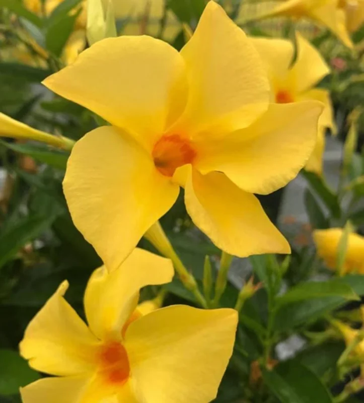 Transform your outdoor space into a tropical paradise with this stunning yellow Mandevilla vine live plant. Also commonly known as Dipladenia or Brazilian Jasmine (botanical name: Mandevilla sanderi), this vigorous climbing plant is celebrated for its profusion of large, bright yellow, trumpet-shaped flowers and attractive glossy green leaves. Originating from the tropical regions of Brazil, the Mandevilla is a fast-growing, evergreen perennial vine that brings continuous color and elegance from spring through fall, making it a favorite for gardeners in warmer climates and as an annual elsewhere. This tropical flowering vine is delivered as a healthy, established plant, ready to thrive and quickly establish itself in your garden or patio.