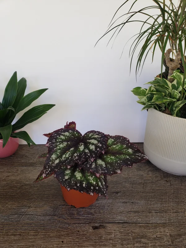 The Rex Begonia Harmony’s Starry Night is offered as a healthy, established live plant in a 4-inch nursery pot. At the time of shipment, the plant typically stands approximately 4-6 inches tall from the soil line, with a spread similar in width, depending on its growth stage. This compact size makes it an excellent choice for tabletops, shelves, or as part of a mixed container garden. Rex Begonias are known for their moderate growth rate, gradually filling out to become a fuller, more substantial plant over time, usually reaching a mature height and spread of 8-12 inches indoors under optimal conditions.