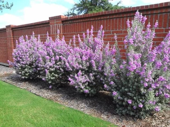When mature, the Leucophyllum frutescens Compacta exhibits a compact evergreen shrub with a rounded form. If grown in containers, it typically reaches a height of approximately 2–3 feet. Planted directly in the ground, it can grow to about 3–4 feet tall. These plants have a moderate growth rate and will quickly establish themselves with proper care. Blooming occurs from spring through fall, often triggered by rain or humidity, providing a long season of vibrant purple flowers. These plants are ideal for creating low hedges, foundation plantings, borders, xeriscaping, and containers, offering excellent versatility in landscape design and adding significant curb appeal.