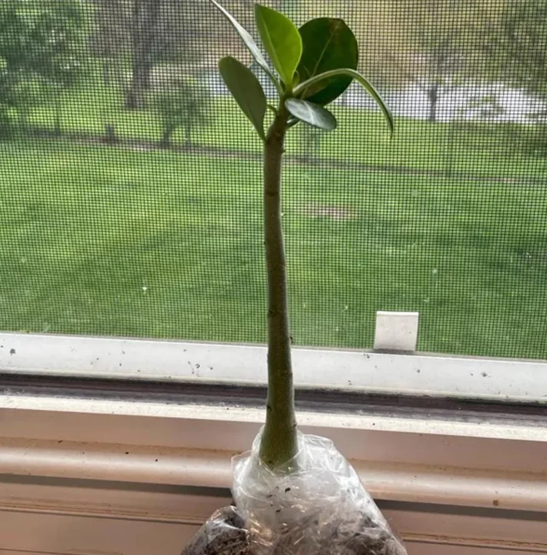 You will receive a set of two healthy pink desert rose live plant starter plants. Each plant measures approximately 4–6 inches tall from the base of the caudex to the top of the foliage. These are young, non-flowering plants, carefully packaged and shipped bare root with their roots wrapped in soil or medium to maintain moisture during transit. The mature size of a Desert Rose can vary, typically reaching 2-6 feet in height and spread when grown in optimal conditions, though they can be kept smaller through container growing and occasional pruning. They are slow-growing succulents, developing their characteristic thick caudex over several years. While these starter plants will not be flowering upon arrival, with proper care and maturity, they will produce abundant pink, trumpet-shaped blooms. They are ideal for growing in containers, allowing for easy relocation indoors during colder months, and are perfect for creating bonsai-style displays or adding to a tropical flowering plant collection, making it a versatile desert rose indoor or outdoor choice.