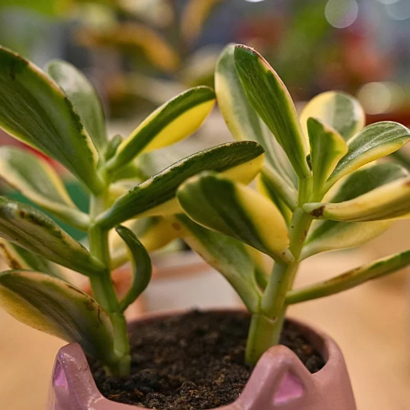 This Crassula Ovata succulent prefers average room temperatures, ideally between 65-75°F (18-24°C), and can tolerate slightly cooler temperatures in winter. Avoid sudden drops in temperature or exposure to cold drafts. While it’s generally pest-resistant, occasionally check for common houseplant pests like mealybugs. If found, treat with insecticidal soap or neem oil. With these simple easy care houseplants tips, your variegated jade plant will thrive and continue to beautify your space.