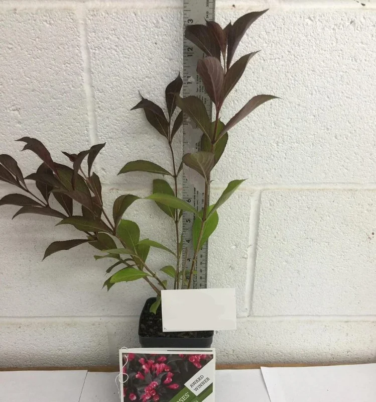 - Q: What size pot does the plant come in? A: The Wine and Roses Weigela live shrub is shipped in a 1 Quart Pot, providing a healthy root system for successful transplanting. The plant itself will be approximately 6-12 inches tall.
